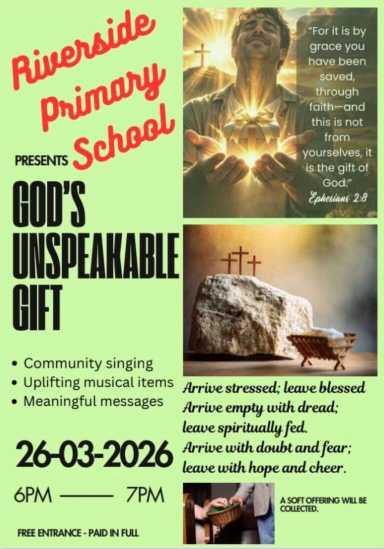 โœ๏ธ Riverside SDA Primary School Easter Musical โœ๏ธ Celebrate the true meaning of Easter with us at Riverside SDA Primary Schoolโ€”an evening of worship, music, and heartfelt storytelling. Join our learners as they share the powerful message of Jesusโ€™ love,โ€ฆ
